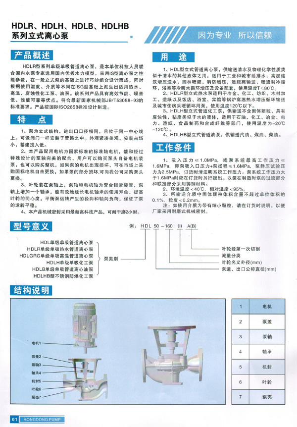 HDLR型系列單級單吸管道離心泵,是本單位科技人員聯合國內水泵專家選用優秀水力模型,采用IS型離心泵之性能參數,在一般立式泵的基礎上進行巧妙組合設計而成,同時根據使用溫度、介質等不同在ISG型基礎上派生出熱水、高溫、腐蝕性化工泵、油泵。該系列產品具有高效節能、噪音低、性能可靠等優點。
